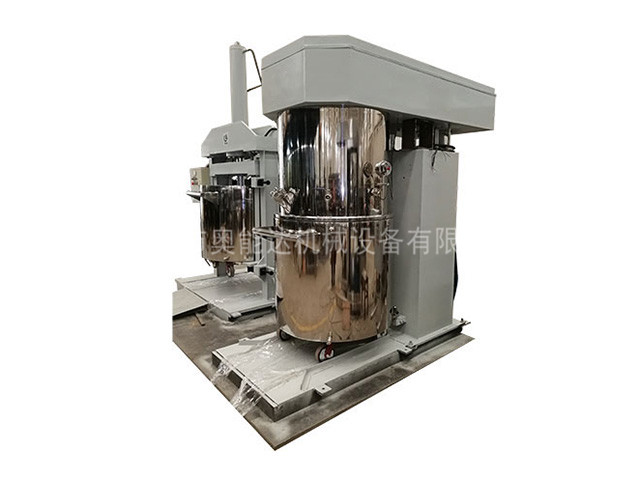 行星分散搅拌机有高速、低速、活动刮板作搅拌、剪切、刮壁、溶解用。低速运转的搅拌锚使物料在密闭容器内上下翻动、剪切和混合,高速运转的齿形分散盘与混合的物料产生强烈的碰击和剪切,随着搅拌锚的旋转,行星架上的活动刮刀随着旋转,把釜体上的物料完全刮掉,使聚集物完全、彻底地达到混合、分散、溶解的要求。在其高低速的不同作用下,使物料能够达到均匀的混合和分散。